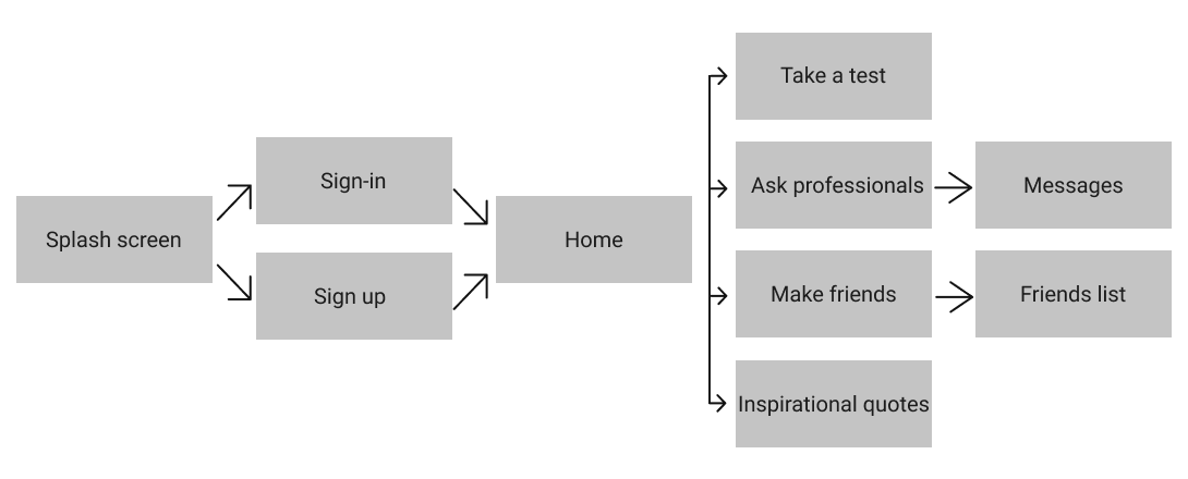 After few more research, I found out that the PHQ-9 test exist, that can be use as a tool, then I decided to focus on that. But still wanted to enhance the app, so I had my mentors to give feedback and asked them to be critique, they also gave me a lot of tips and recommendations for my project. Like adding an on-boarding pages, putting the question clearly and without making the users think what was the question and click the button back just to re-read what is it about. After re-designing, adding more content and finishing the design, I started to do some user app testing with friends and relatives. They asked if I could add colors and another language, and I made it happen.
